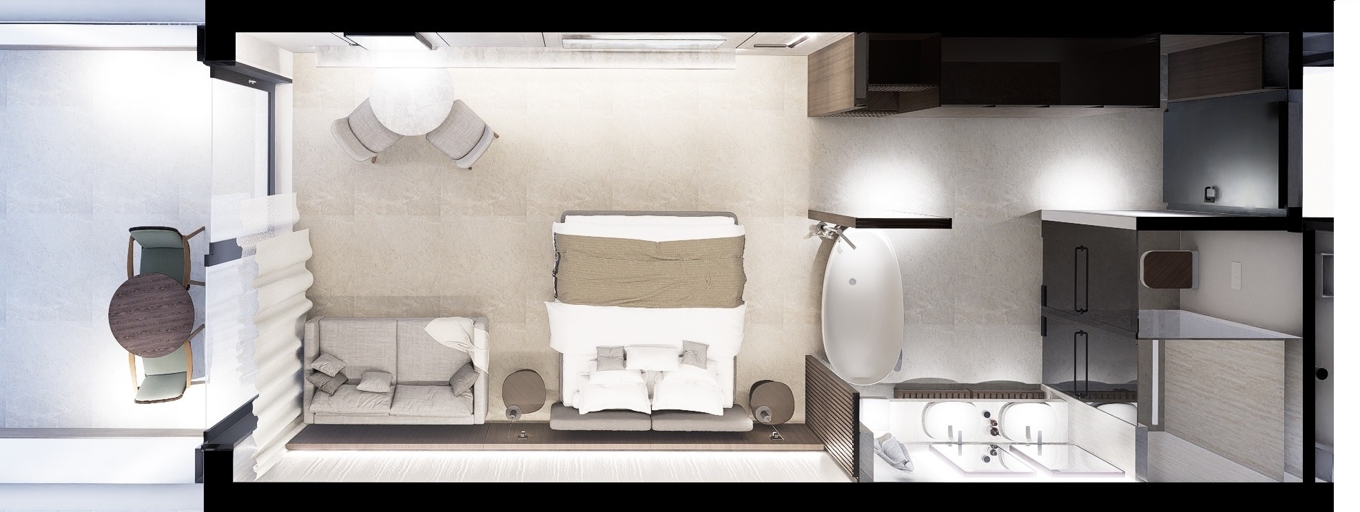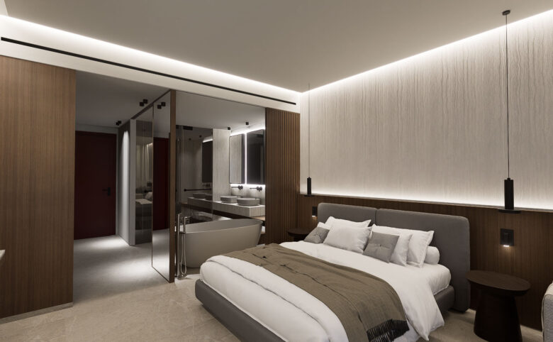 Featuring a king-size bed (1.80m x 2.00m) and a pull-out sofa for extra guests, this room comfortably accommodates up to 3 adults or 2 adults & 2 children. The free-standing bathtub, walk-in rain shower, and double wash basins add a touch of spa-like indulgence, while the private furnished balcony offers the perfect setting to enjoy the Aegean Sea breeze.